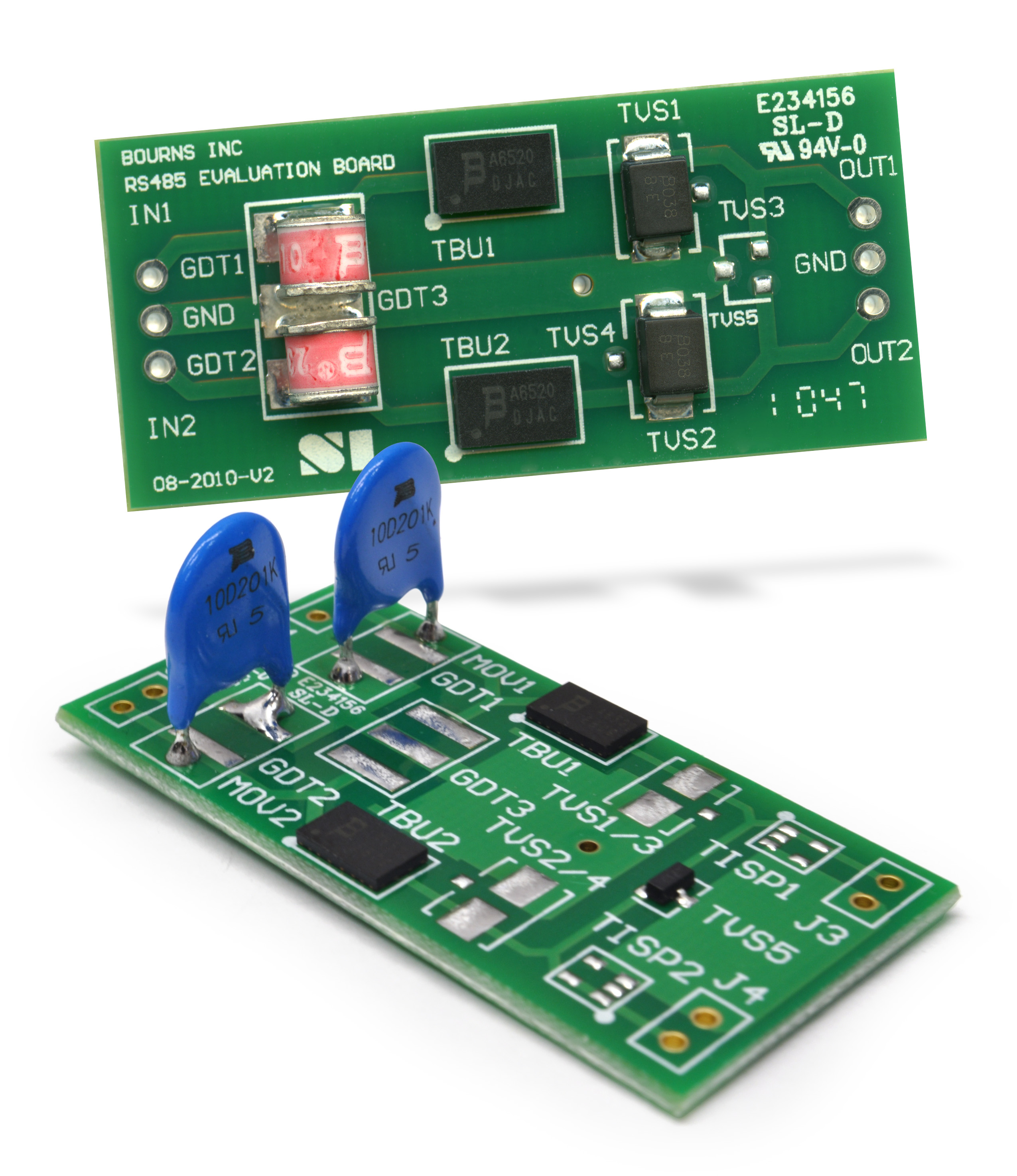 MOV-Produkten ausgerüstet und dienen als Entwicklungsressource für die Optimierung von Schutzabschaltungen serieller RS-485-Geräteschnittstellen. Um den erforderlichen Industriestandards für RS-485-Schnittstellen zu entsprechen, bieten die neuen Platinen zwei verschiedene Evaluierungsansätze. Das Bourns RS-485EVALBOARD1 enthält zwei Bourns® TBU® High-Speed Schutzeinrichtungen (HSPs), zwei Bourns® GDTs mit Schnellabschaltung und zwei Bourns® TVS-Dioden. Das Bourns RS-485EVALBOARD2 verwendet Bourns® TBU® High-Speed Schutzeinrichtungen (HSPs), MOVs und TVS-Produkte.
